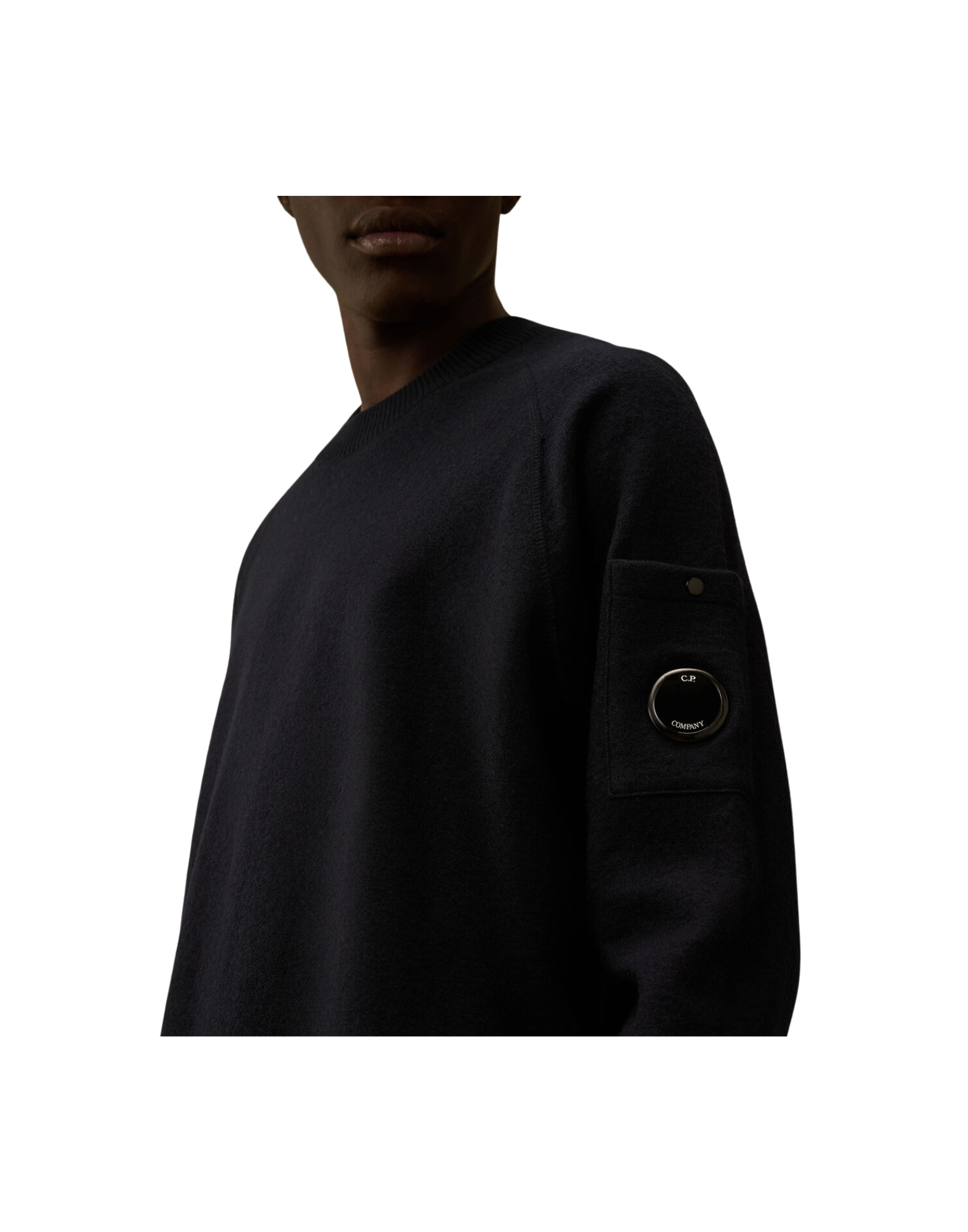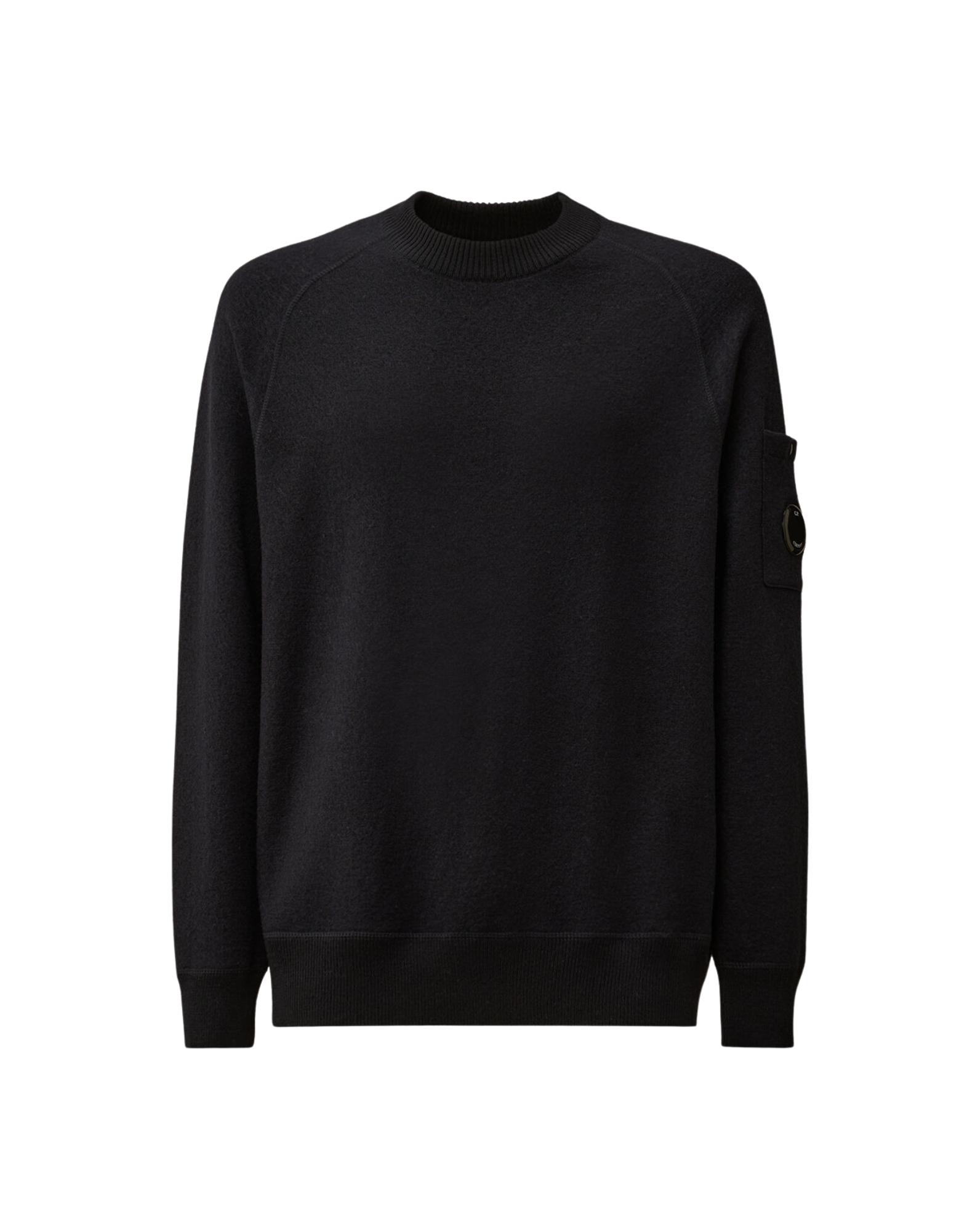 Maglione girocollo infeltrito in lana merino. Il modello presenta maniche raglan, l'iconica Lente di C.P. Company, polsini e orlo a costine. Finezza 12. Regular fit.