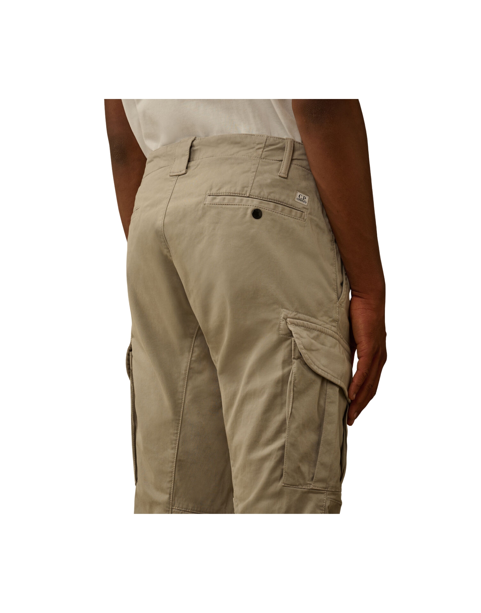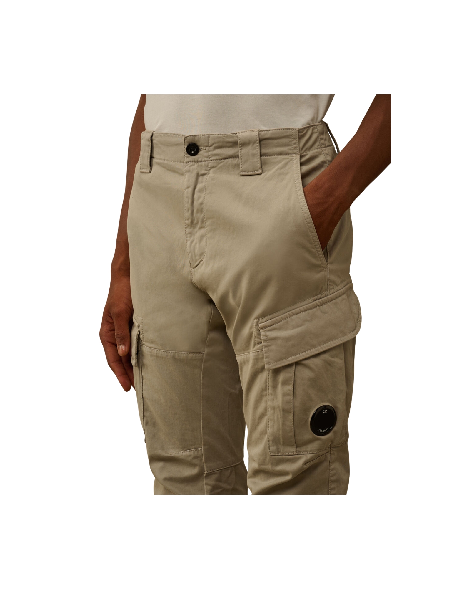 Pantaloni cargo realizzati in raso di cotone stretch smerigliato. Il capo presenta l'iconica Lente di C.P. Company, chiusura con bottone e zip, passanti per la cintura, tasche laterali e tasche cargo con patta e bottoni automatici. Rifiniti con tasche posteriori a filetto con bottoni automatici, completate da etichetta applicata. Tinti in capo. Ergonomic fit.