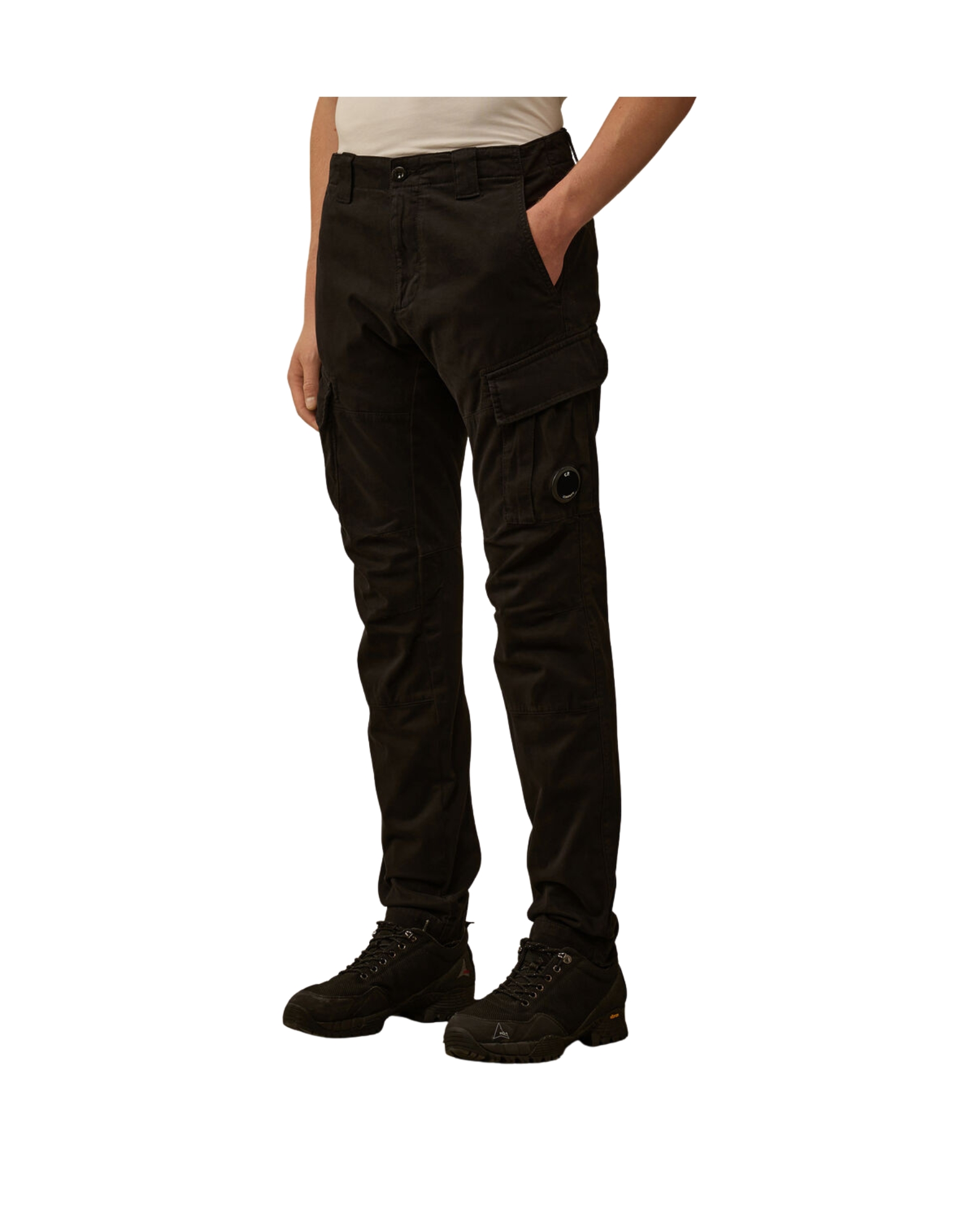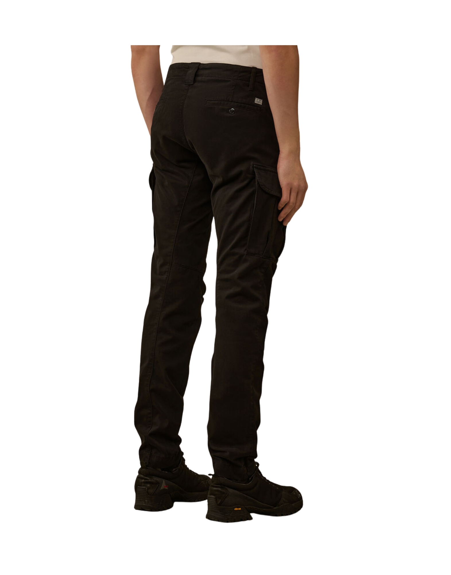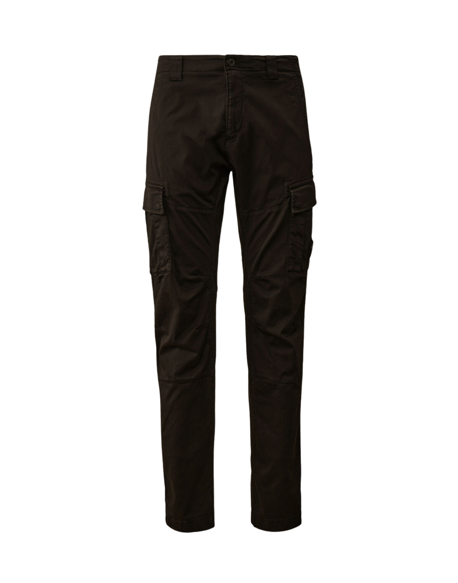 Pantaloni cargo realizzati in raso di cotone stretch smerigliato. Il capo presenta l'iconica Lente di C.P. Company, chiusura con bottone e zip, passanti per la cintura, tasche laterali e tasche cargo con patta e bottoni automatici. Rifiniti con tasche posteriori a filetto con bottoni automatici, completate da etichetta applicata. Tinti in capo. Ergonomic fit.