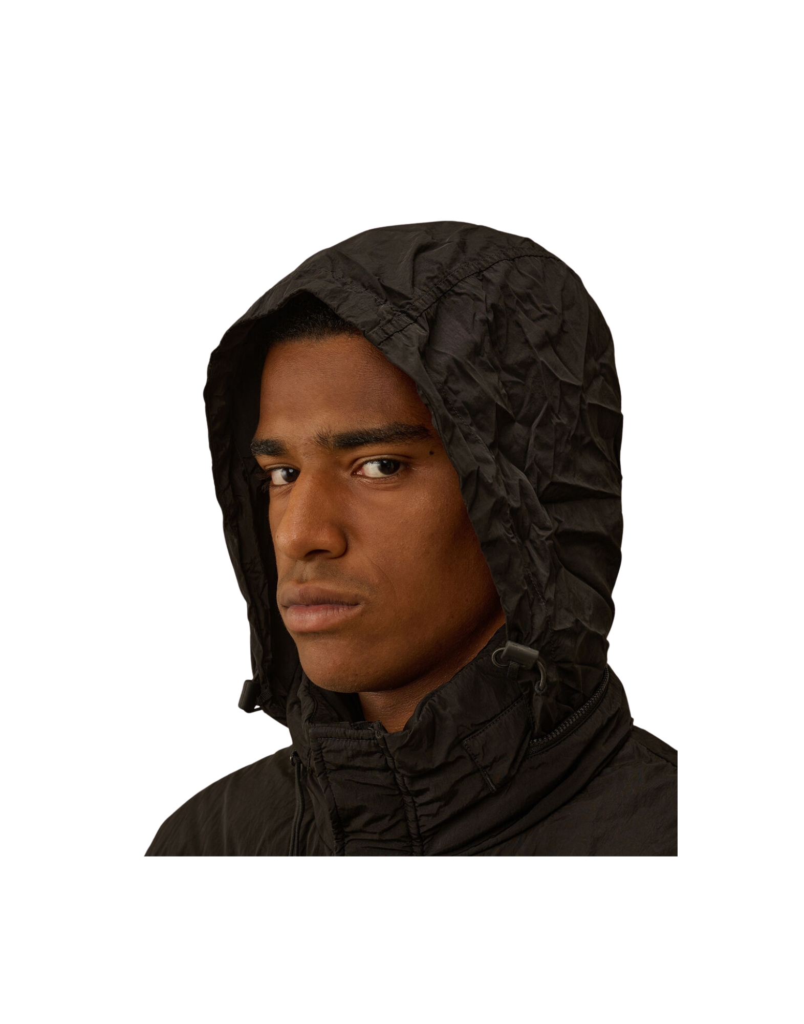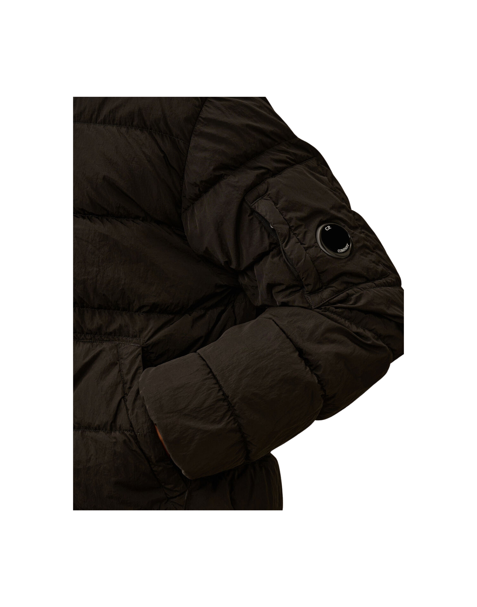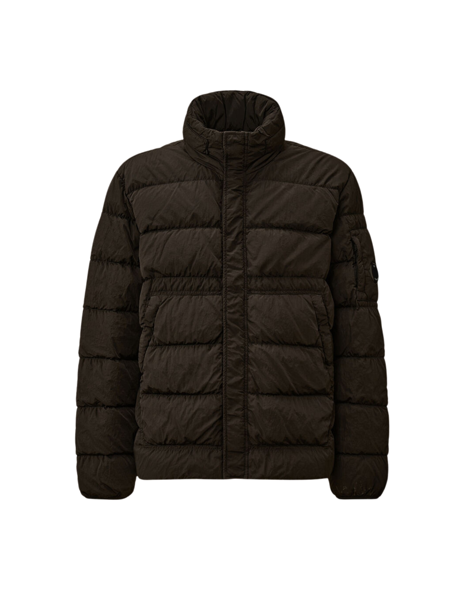 Piumino realizzato in Chrome-R, un nylon multifilamento lucido e riciclato al 100%, ottenuto da scarti di lavorazione trasformati in una nuova fibra certificata Global Recycled Standard (GRS). Il modello è dotato di cappuccio a scomparsa con zip, chiusura full zip a doppio cursore nascosta da patta con bottoni automatici e tasche laterali con zip. Rifinito con liconica Lente di C.P. Company, polsini elasticizzati e orlo regolabile con coulisse. Tinto in capo con trattamento anti-goccia. Regular fit.