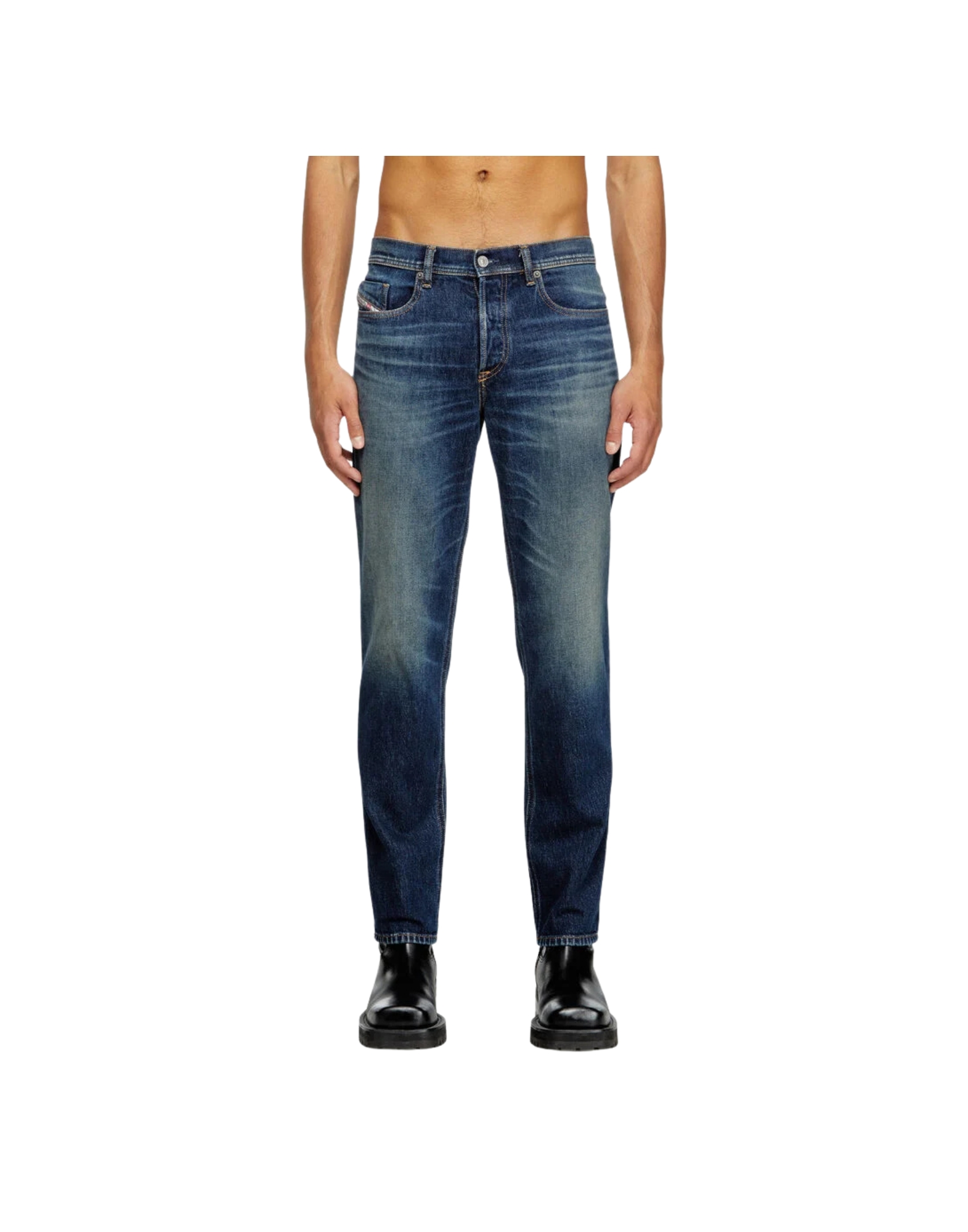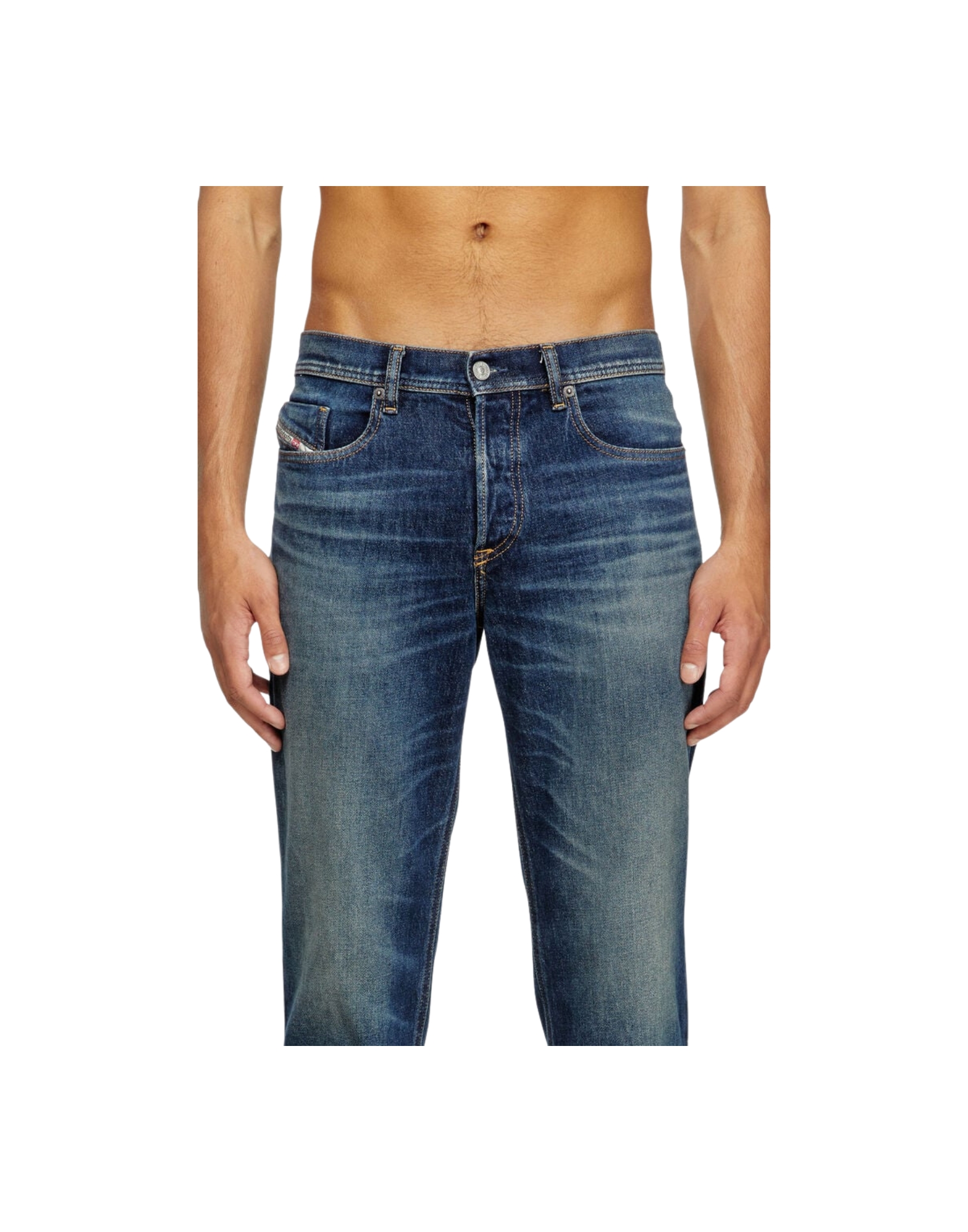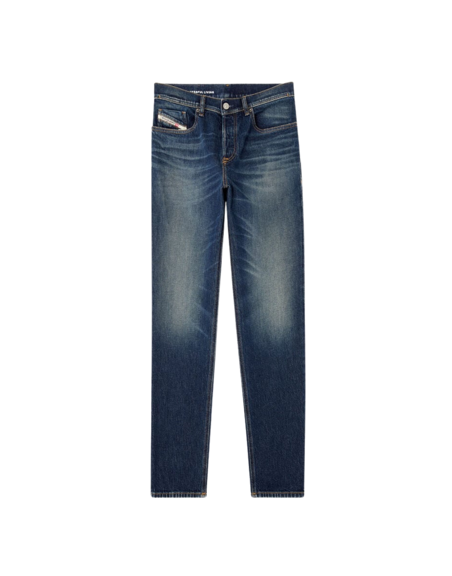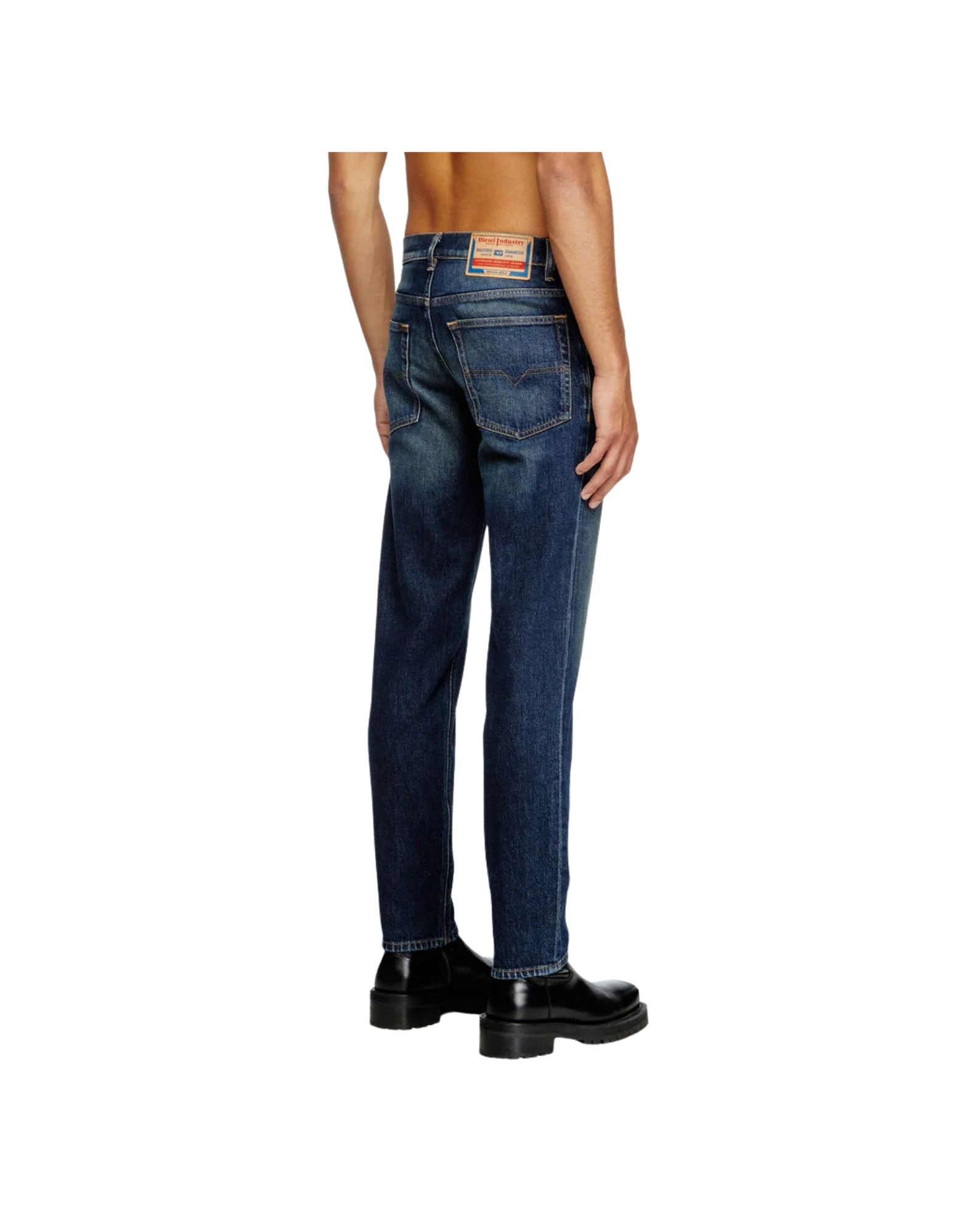 Realizzato in cotone parzialmente riciclato, questo denim comfort fa parte della collezione DNA. Il capo presenta un lavaggio blu scuro con whisker ed effetti used sulla parte superiore della gamba un dettaglio distintivo dei jeans Diesel.