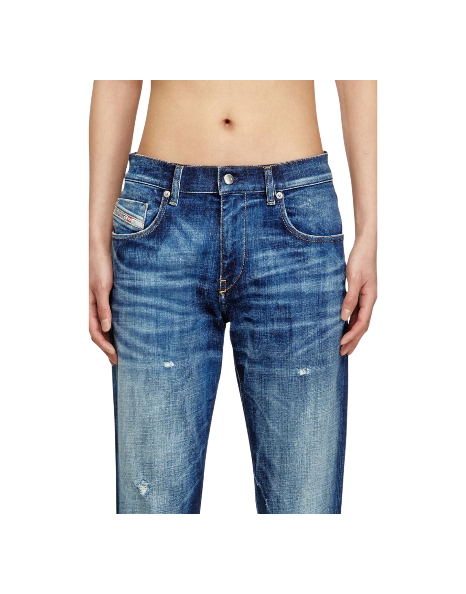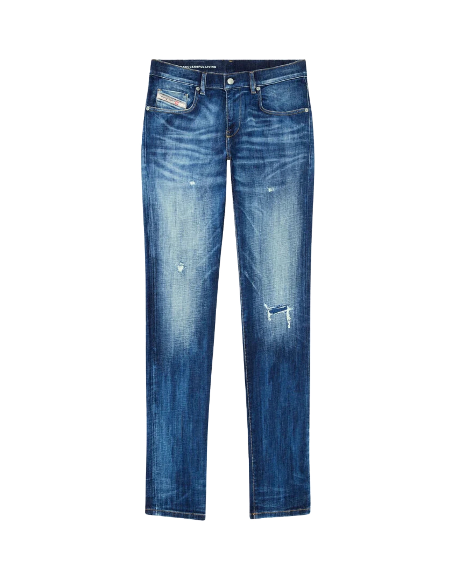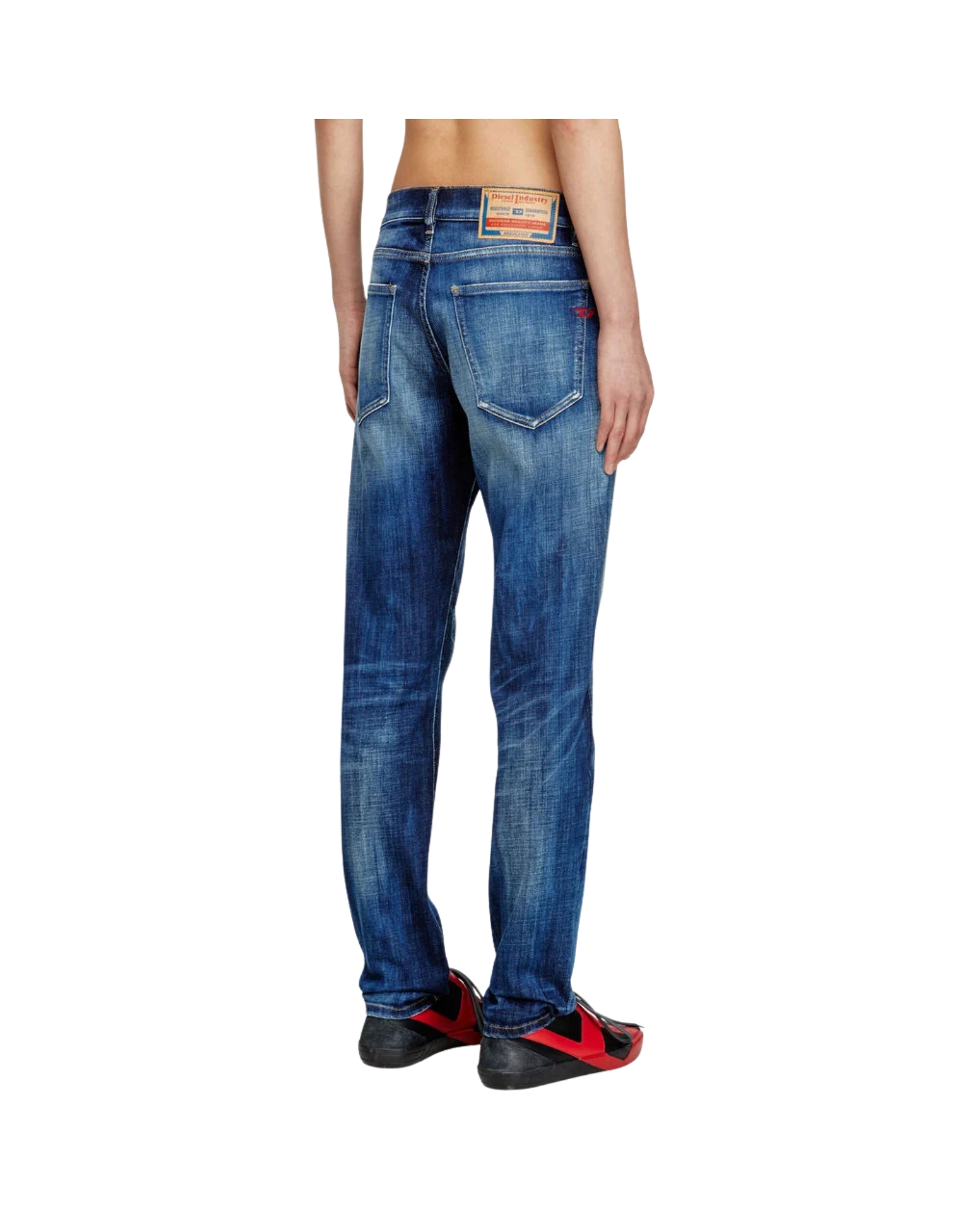 Denim comfort in cotone parzialmente riciclato. Il lavaggio blu scuro vanta un look DNA distintivo, con whisker a contrasto e piccole abrasioni lungo tutta la gamba. Il ginocchio ripped and repaired completa il design.