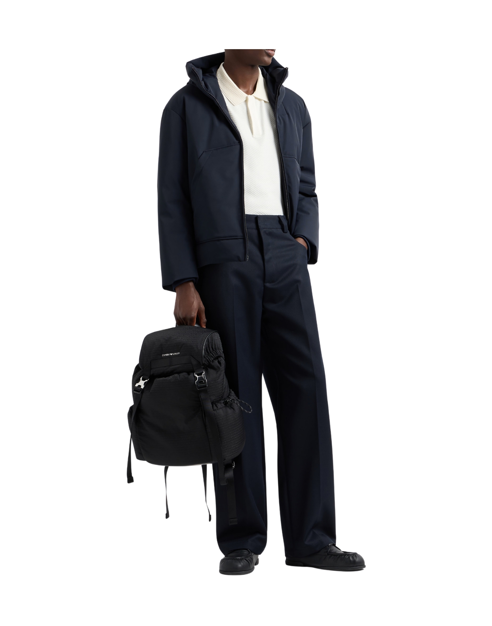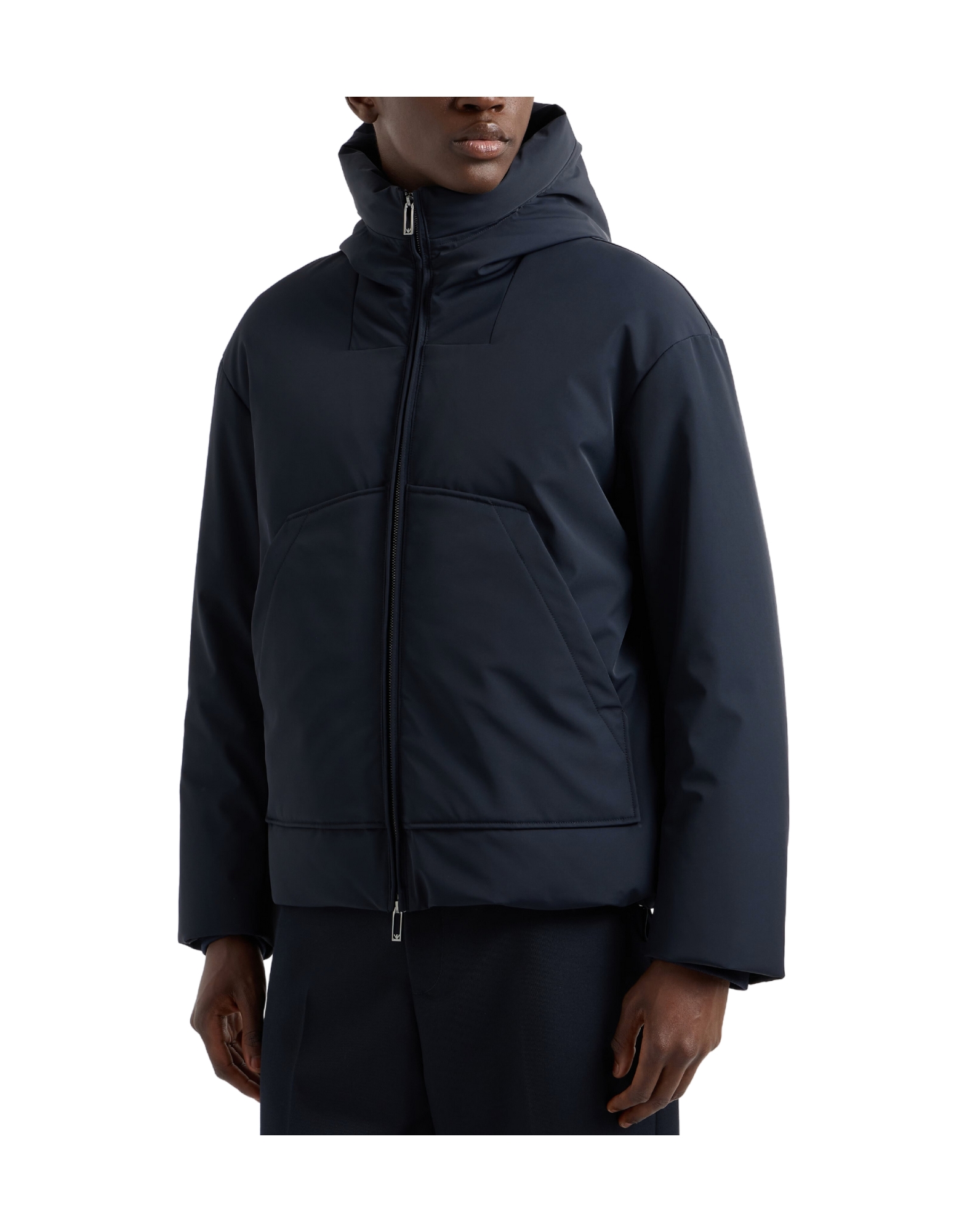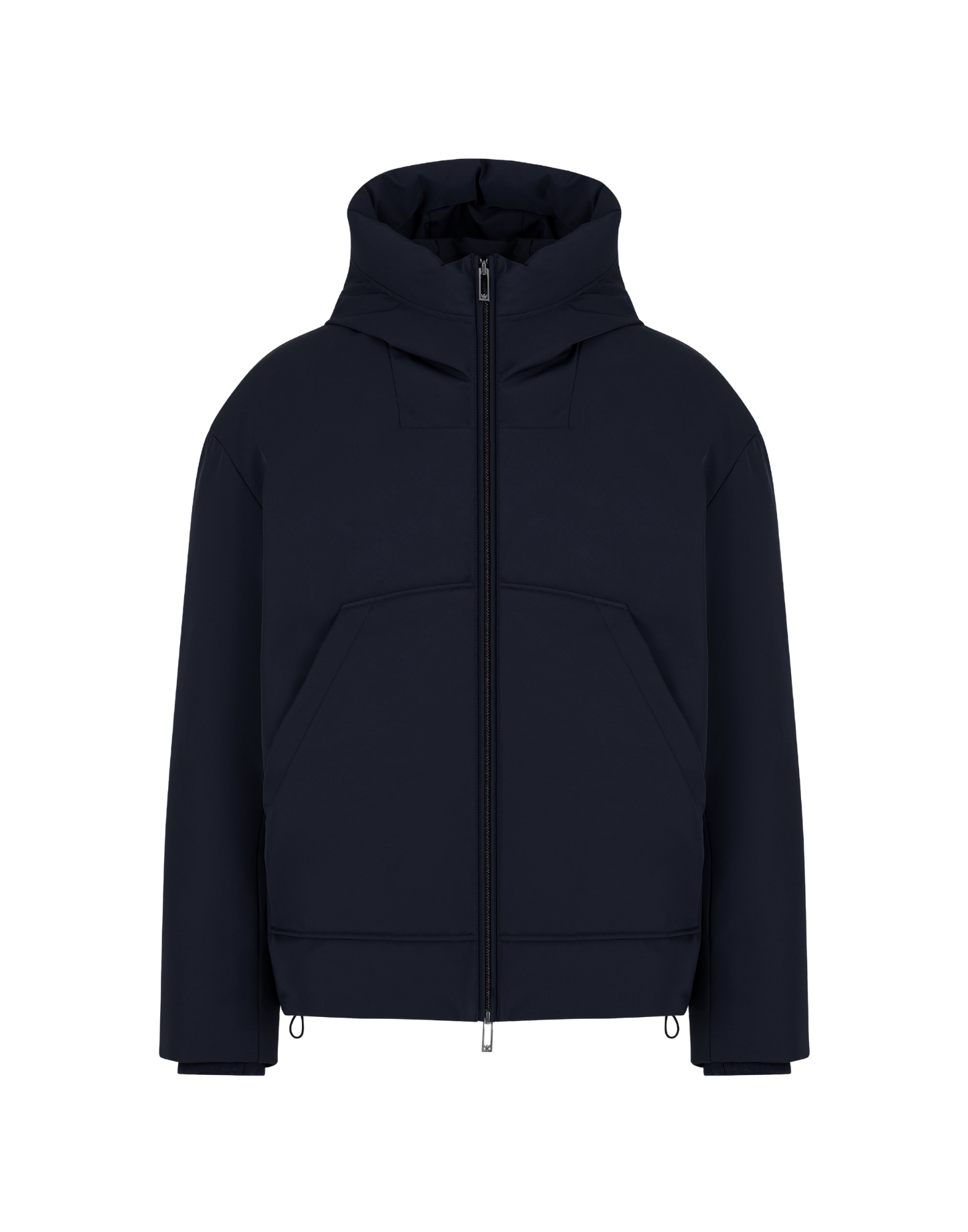 Piumino provvisto di cappuccio e chiusura con zip, realizzato in twill di nylon. Il capo è realizzato in un particolare tessuto a tre strati: le fibre di poliammide tessute con trama twilll assieme allo spandex sono combinate ad un film laminato e ad un ulteriore strato in poliestere che dona al capo un aspetto pulito, casual e di tendenza. Si crea così un capo outerwear idrorepellente che garantisce un comfort, una flessibilità e una durabilità denza eguali.