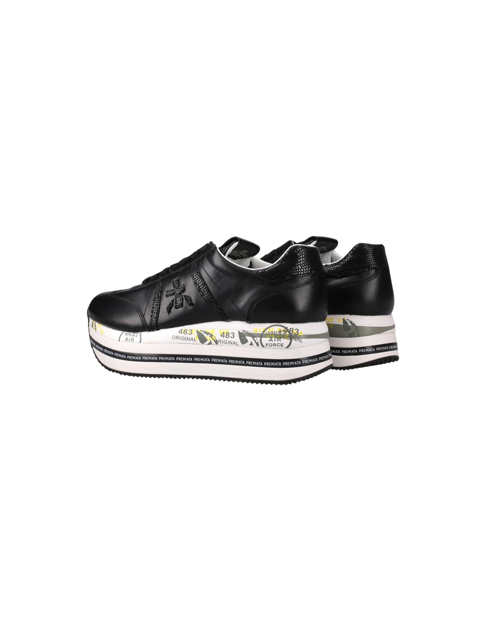Sneakers Beth con tomaia realizzata in pelle nera. Fondo platform personalizzato dalla serigrafia logata Premiata.